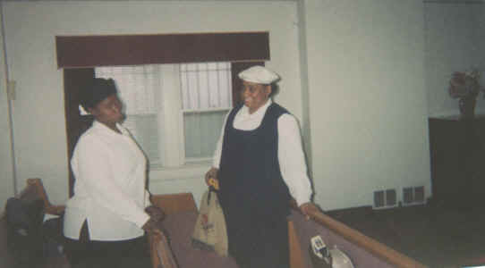 Young Adult Missionary, Sister Cheritha Smith (left), share a moment of laughter with a Sister from the Whole Truth Church of the Lord Jesus Christ.